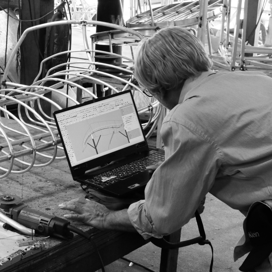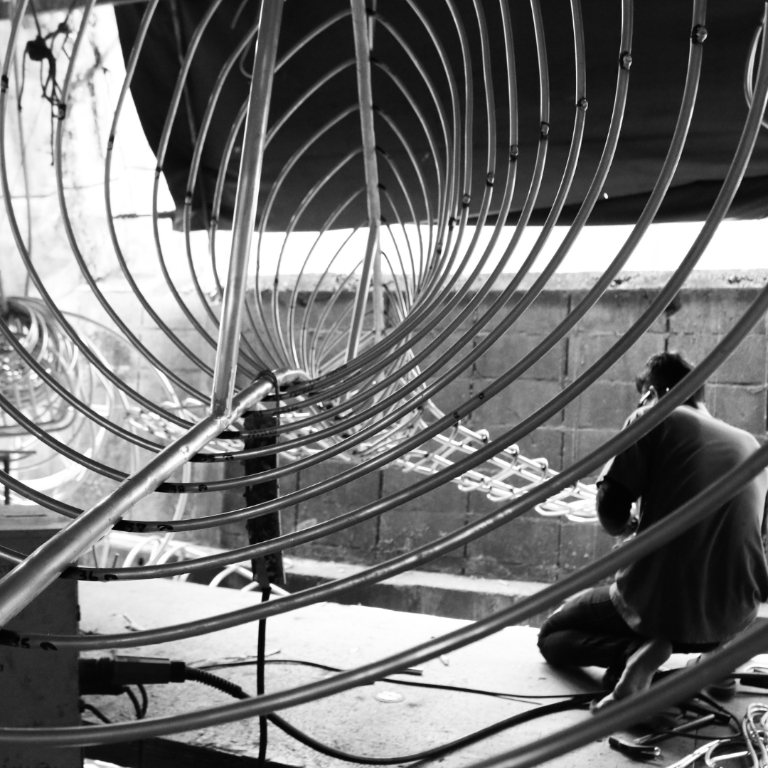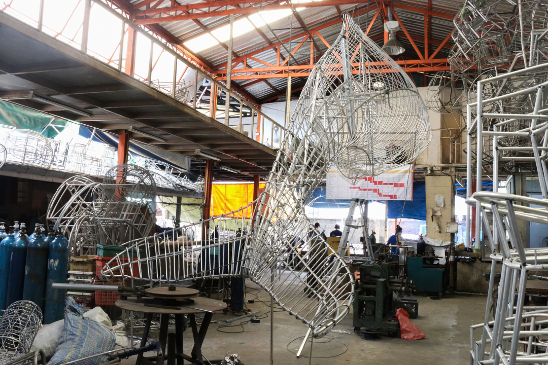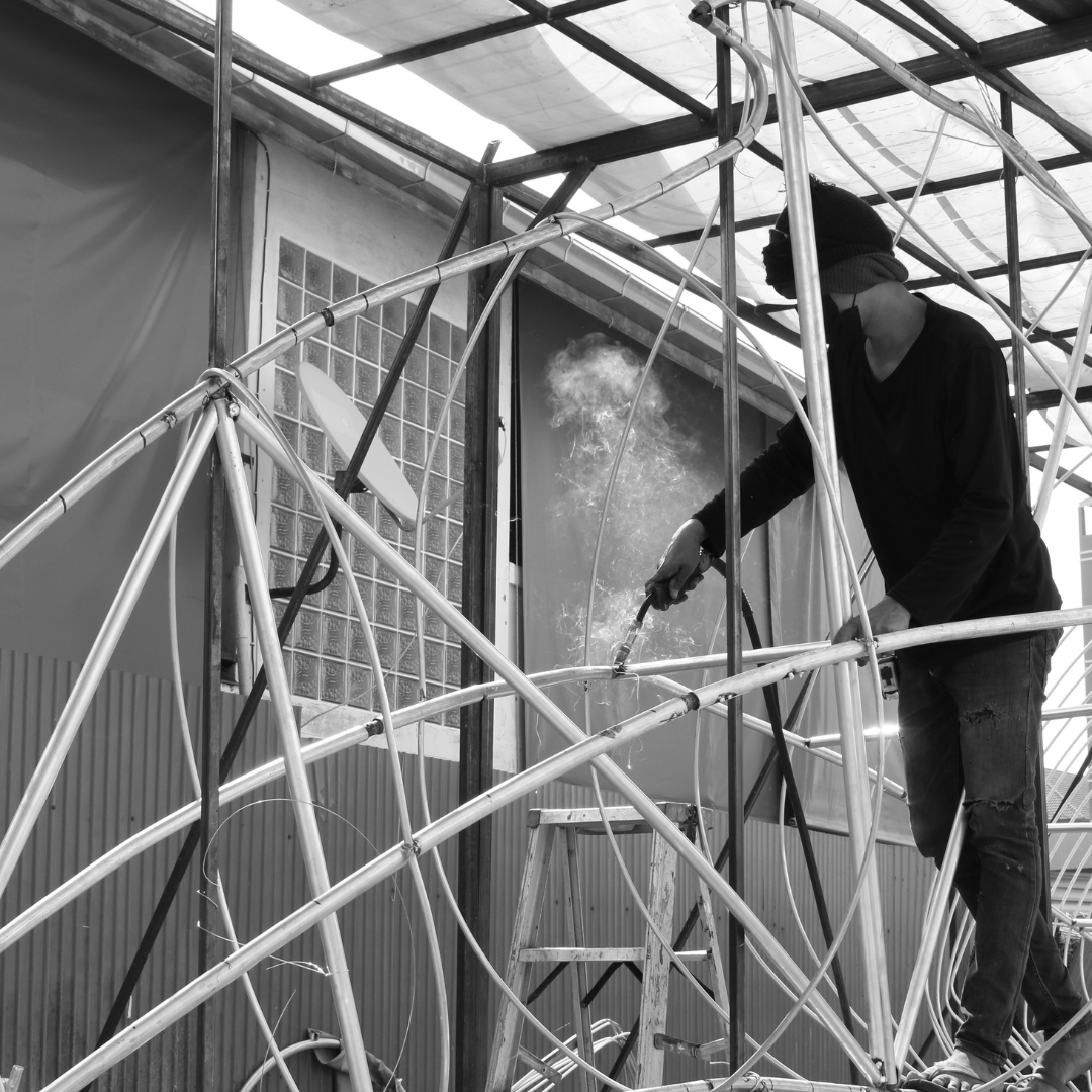 เราเริ่มจากการดัดอลูมิเนียมตามแบบไวนิลที่ปริ้นมา ซึ่งต้องละเอียดมาก ๆ เพราะแบบค่อนข้างดีเทลเยอะ ทีมช่างโครงของเราถึงกับเอ่ยปากเลยว่างานนี้หินแน่นอน ความท้าทายของเราคือหลังจากเราดัดเส้นอลูมิเนียมแล้ว เราจะประกอบเป็นตัวอย่างไร ก่อนอื่นเลยต้องมีตัวยึดก่อนนั่นคือ “นั่งร้าน” เราออกแบบให้เป็นรูปทรงเหมือนกล่องสี่เหลี่ยมที่ขังวาฬเอาไว้ และยังอำนวยความสะดวกต่อทีมช่างด้วย สามารถที่จะเชื่อมที่จุดไหนก็ได้ ทีมช่างนำโครงที่ดัดไว้มาเชื่อมให้เป็นรูปร่างวาฬทีละเส้น ๆ จนประกอบติดต่อกันออกมาเป็นครอบครัววาฬที่สมบูรณ์แบบมาก ๆ