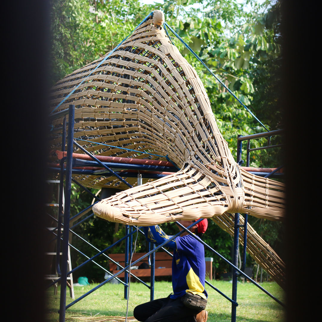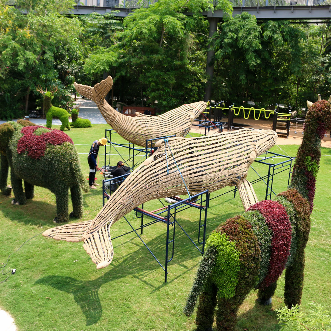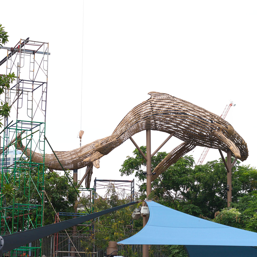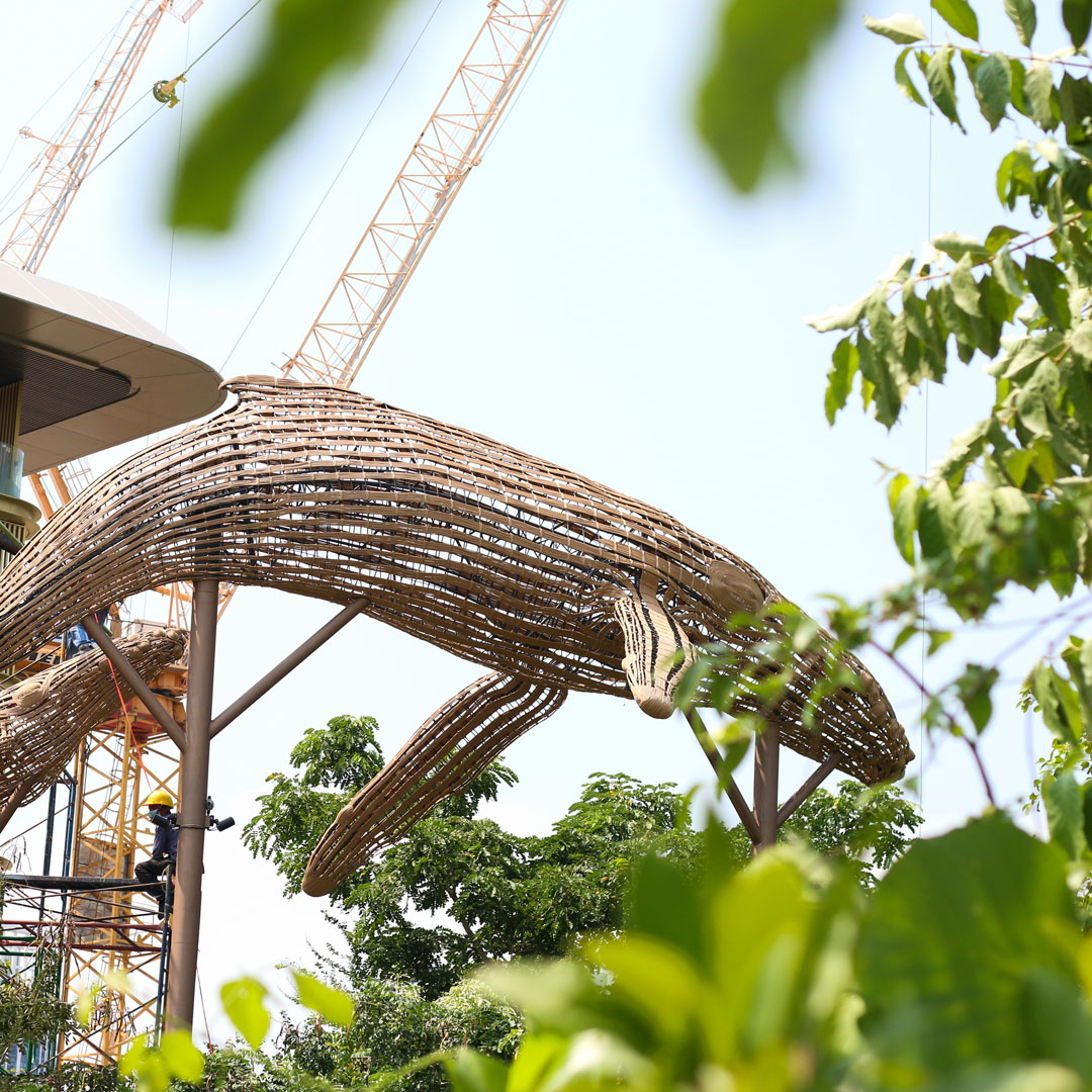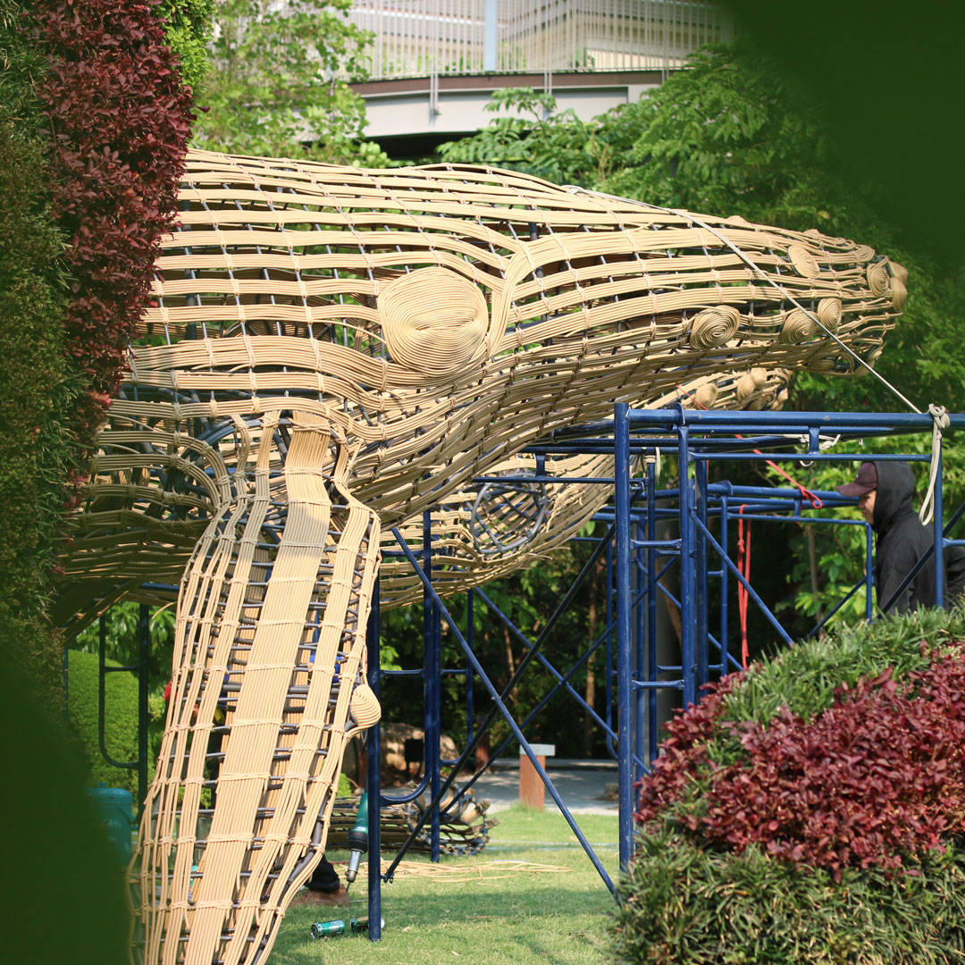 และองค์ประกอบที่เป็นเมนหลักของโปรเจคนี้ วาฬ เราได้ขนตัววาฬทั้งหมดไปไว้ที่สนามเด็กเล่น ตัววาฬได้แยกชิ้นส่วนอยู่ เราได้ทำการประกอบ หัว ลำตัว อยู่ด้านล่าง และก่อนจะนำไปติดตั้งบนเสา ต้องทำการเก็บรายละเอียดขั้นสุดท้าย เส้นหวาย สี ถึงแม้ว่าวาฬจะอยู่สูงเหนือพื้นดินมาก อาจจะมองไม่เห็นจุดที่ไม่สวยแต่เราก็ไม่ปล่อยจุดเล็ก ๆ น้อย ๆ นั่นไป เราทำการแก้ไข เพื่อให้วาฬสวยทั้งตอนมองใกล้ ๆ และตอนมองใกล้ ๆ